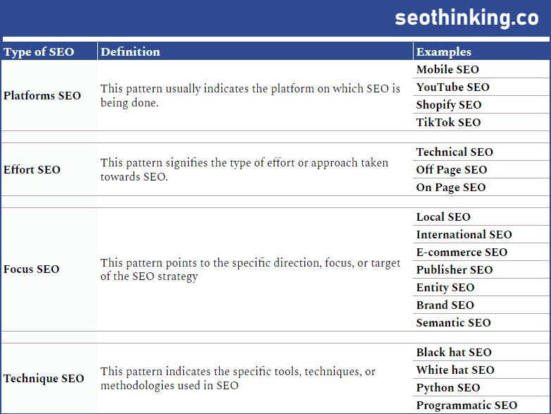 SEO often comes prefixed with various terms—Technical, Brand, YouTube, Black Hat/White Hat, Teleological-SEO, Python-SEO (🤷♂️); And the list goes on. Being a patternaholic (not a word, don’t care), I wanted to break down the types I’m familiar with into distinctive context groups to unlock how SEO is communicated. So I started by segmenting the types of SEO into sub-types like Platform-SEO, Effort-SEO, and so on.